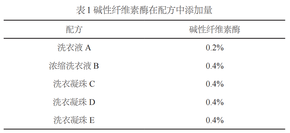 使用堿性纖維素酶(溢倍佳C-L 001),測(cè)試其單獨(dú)添加或與堿性蛋白酶配伍后在多種類型洗滌劑中的效果。實(shí)驗(yàn)采用國(guó)標(biāo)污布(JB-01、JB-02)與國(guó)際污布(如草漬布、血漬布等),評(píng)估堿性纖維素酶對(duì)去污能力及織物護(hù)理效果的影響。具體添加量見(jiàn)(表1)。實(shí)驗(yàn)通過(guò)模擬老化織物進(jìn)行護(hù)理性能測(cè)試,并評(píng)估配方中酶的穩(wěn)定性。