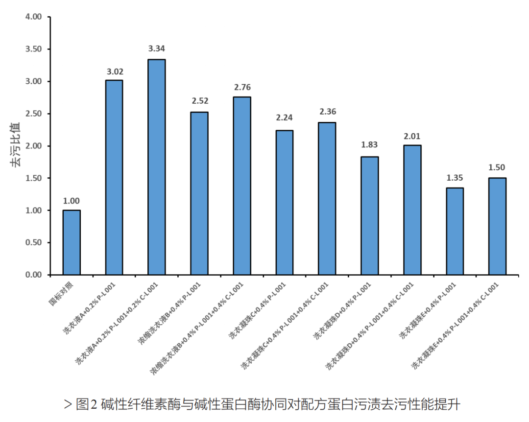 堿性纖維素酶在炭黑污布上的效果顯著(圖1)。單獨(dú)添加可使普通洗衣液的去污力提升23%,濃縮洗衣液和高去污洗衣凝珠的效果也分別提升15%-30%。其對(duì)蛋白污布的清潔能力(圖2)與蛋白酶協(xié)同作用,進(jìn)一步增強(qiáng)了配方性能。